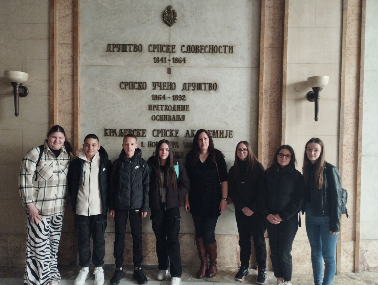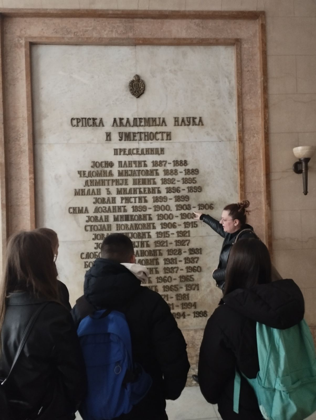 У Палати САНУ госпођа Наташа Васић нас је упознала са историјатом ове веома важне установе српске културе. Имали смо прилику да видимо Свечану салу, библиотеку, спомен- собе Милутина Миланковића и Марка Ристића. Тренутно је у Музеју Југославије изложба посвећена Бранку Ћопићу па његов легат нисмо видели. Напоменула је да смо једина група која је пожелела да се слика у читаоници библиотеке која се ученицима веома свидела.