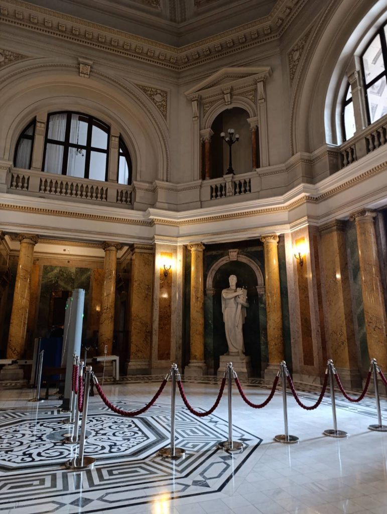 У Народној скупштини срдачно нас је примила госпођица Мирјана Станић која нас је спровела кроз централни хол, малу и велику пленарну салу, велику скупштинску библиотеку, одборску салу и дипломатски салон. Ученици нису крили одушевљење и интересовање како архитектуром тако и унутрашњим изгледом зграде.